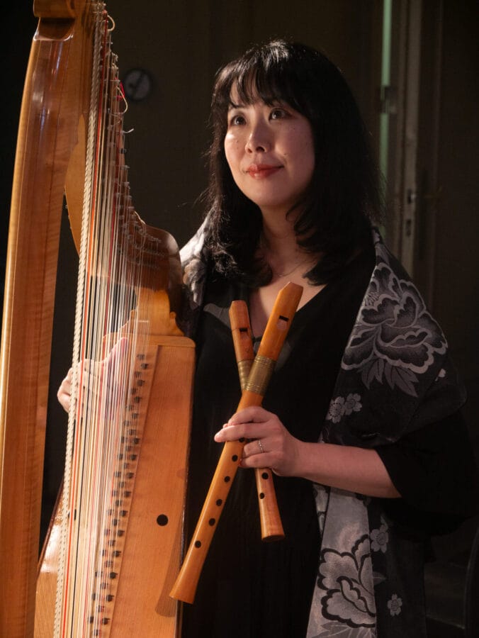 Spécialisée en musique ancienne et musiques du monde, Emi joue la harpe triple et la flûte à bec, créant des passerelles entre traditions orientales et occidentales.